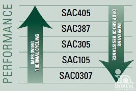 | SAC405 | 95.5Sn/4.0Ag/0.5Cu | 217 | 225 | 當(dāng)要求使用熱可靠性高于含銀較少的SAC合金時的最佳解決方案 |